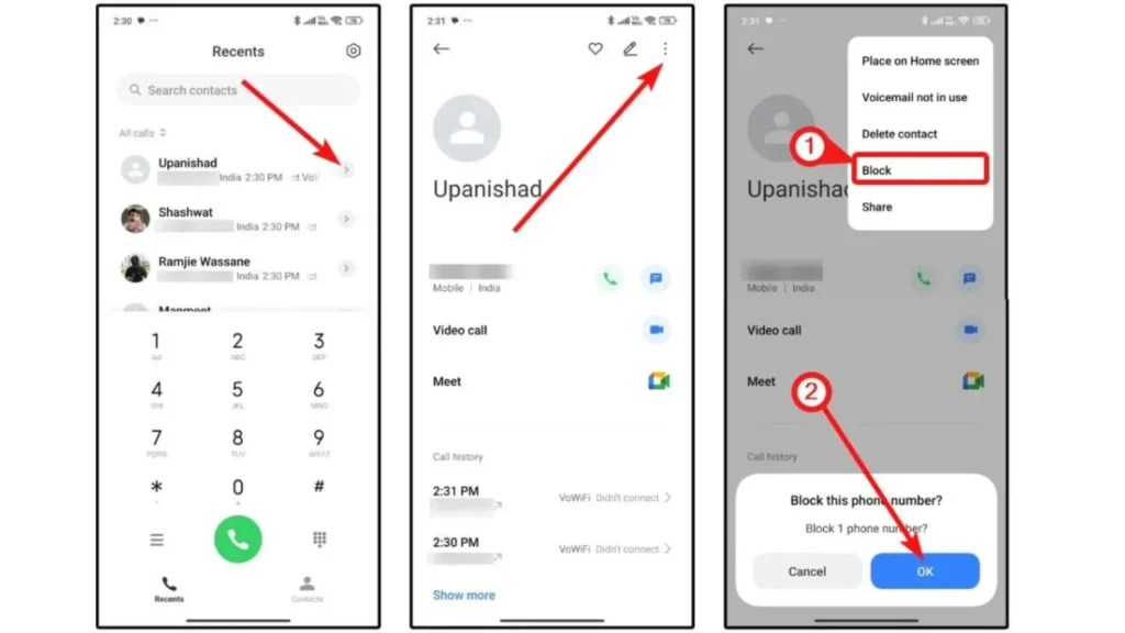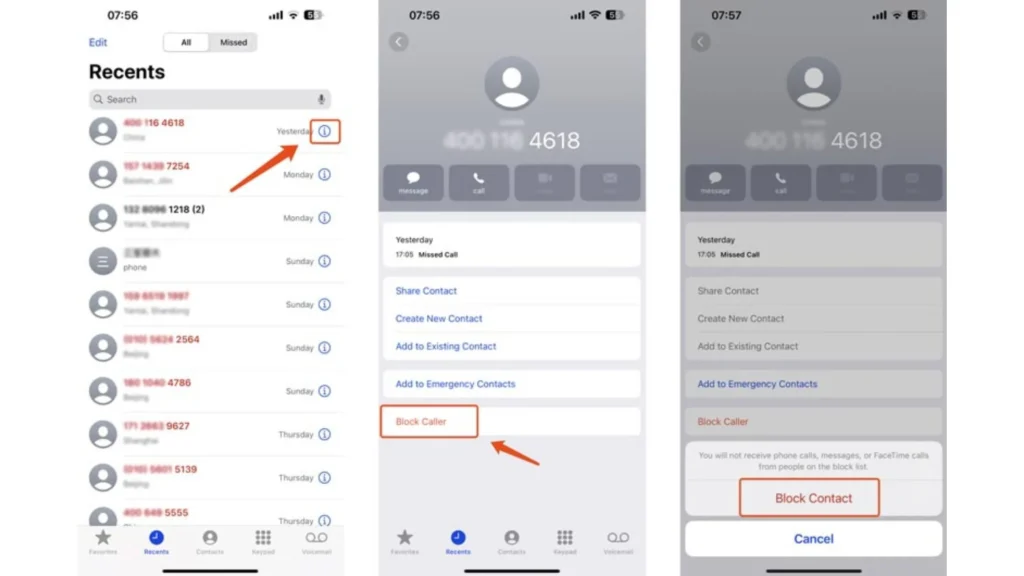 - On iPhone: Open the Phone app → Recent calls → Tap the “i” icon → Scroll down and tap “Block this Caller.”