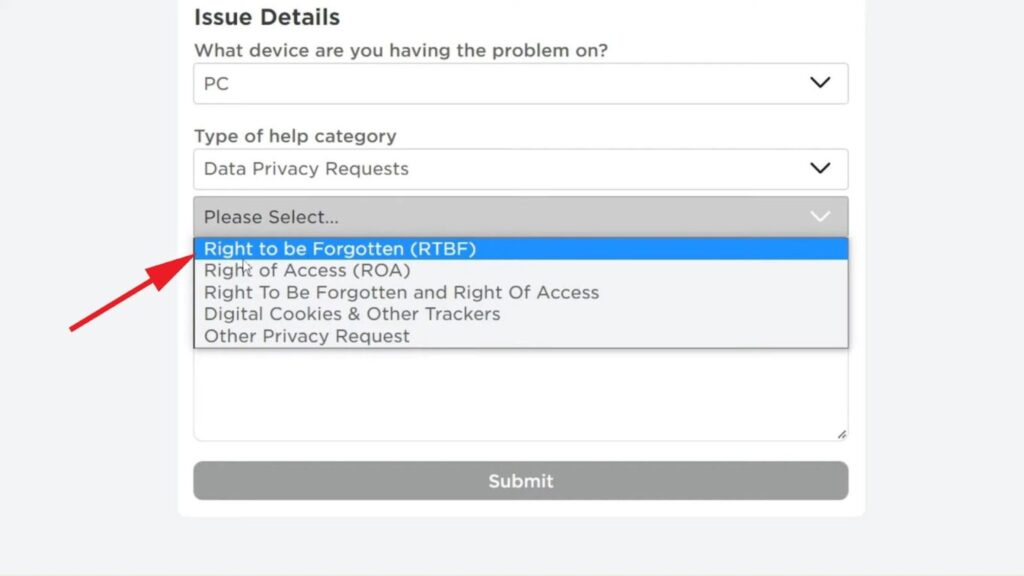 - Request Type: In the next dropdown box, select “Right to Be Forgotten (RTBF).” This option explicitly requests Roblox to permanently delete your account data.
