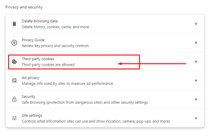 - Select Cookies → choose Block third-party cookies.